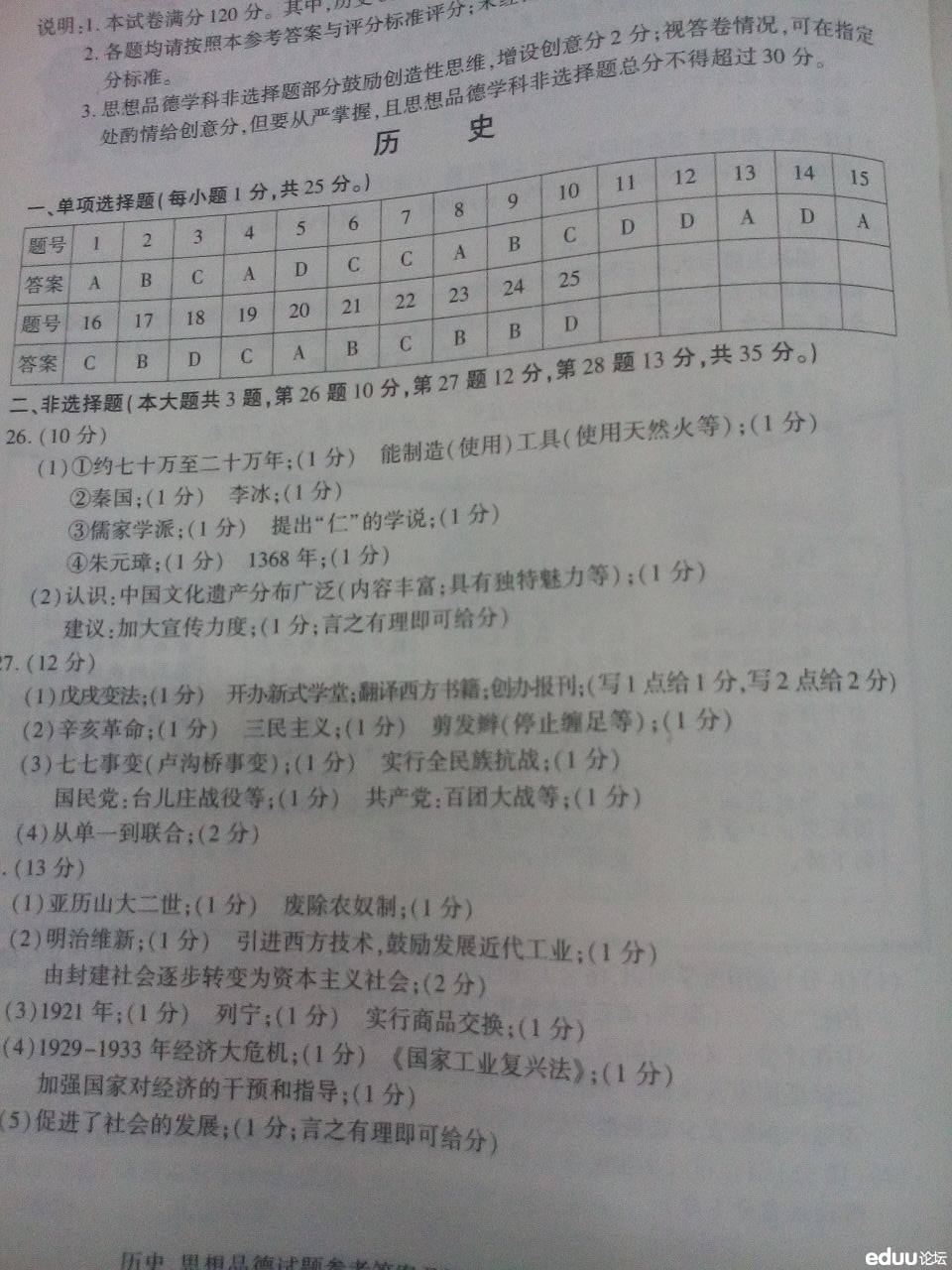 【查看原帖并参与讨论:2014年南京中考历史答案及评分标准