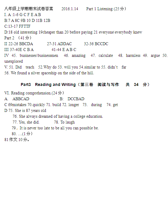 2015-2016八年级(上) 梅山二中区期末英语试题答案