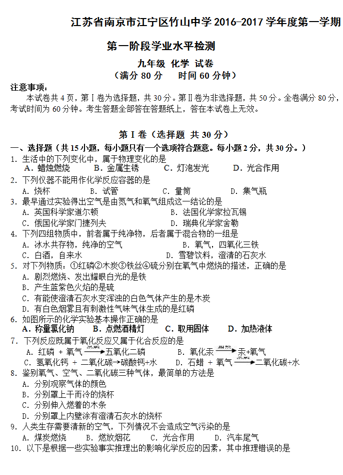2016-2017学年南京市江宁区竹山中学度第一学期九化学试题