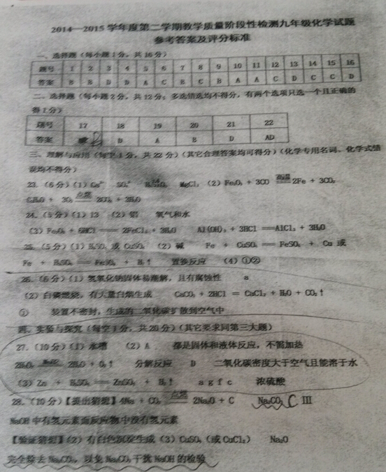 青岛市开发区十二中2015届九年级第二次模拟考试化学试题答案