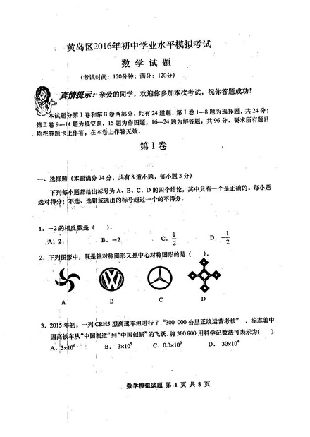 2016年5月黄岛区中考二模数学试题