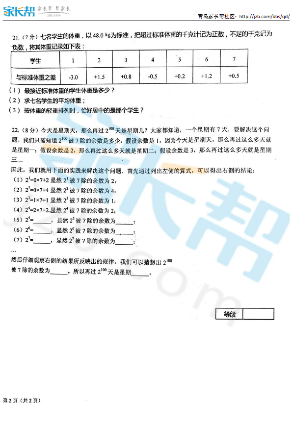 2016年10月青岛超银中学(鞍山路校区)初一月考数学试题(4)