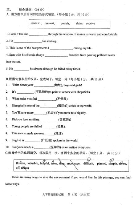 2016-2017学年青岛第37中学期初模拟考试英语试题(7)