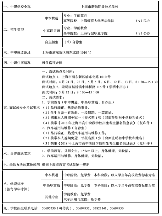 2018上海中职学校提前批招生公示:上海市新陆职业技术学校