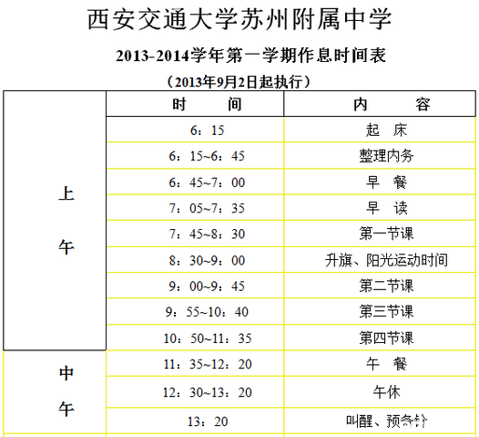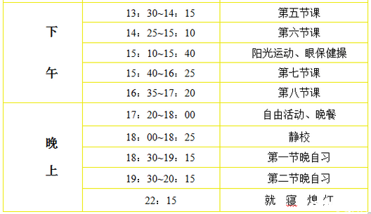 住宿生6:15起床,七点钟到教室开始早读课,上午会有半小时的体育锻炼的大课间,帮助孩子加强体锻;中午一个小时的午休时间;如果不住校的话,5:20即可离校,其他学生晚自习上到九点半左右。不过目前来看,几乎所有的学生都是在校上完三节晚自习,因为有每个班级都有老师辅导,所以孩子们应该也更愿意集体自习,这样也可以及时的解决作业中遇到的问题。