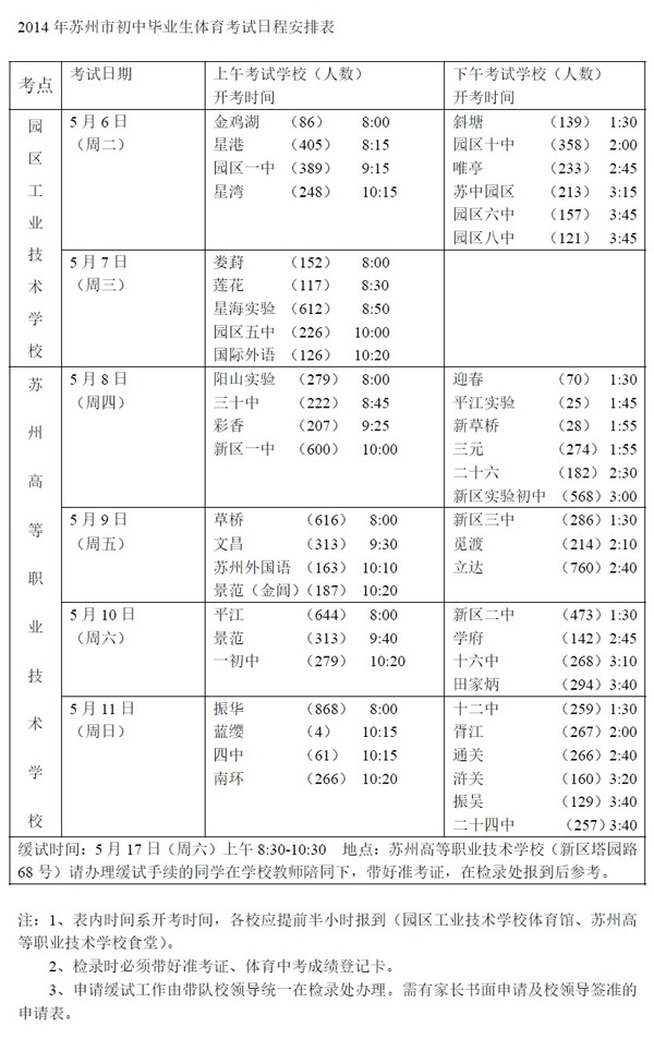 2014年苏州市初中毕业生体育考试日程安排表 2014-05-08 10:41:12小叮当de时光机 【查看原帖并参与讨论:2014年苏州市初中毕业生体育考试日程安排表】 编辑推荐: 2014年苏州中考体育政策和项目介绍 关于组织2014年苏州市初中毕业生体育考试的通知 2014年苏州中考体育项目训练技巧