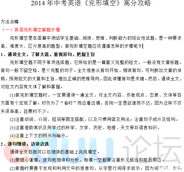 【查看原帖并参与讨论:2014年中考英语《完形填空》高分攻略及例题解析】