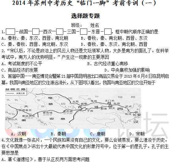 【查看原帖并参与讨论:2014苏州中考历史考前专训(一) 选择题专题】