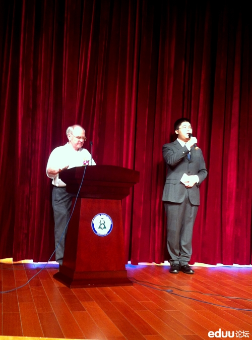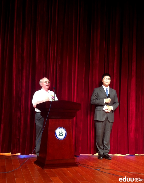 外教上台,胖纸主持帮忙翻译。据说这个外教是特意为了这个毕业典礼,不远万里前来的。