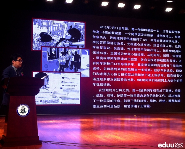 校长特别奖的故事:他们高一时班级同学携手挽救了一位因心脏病突然晕倒的同学,而他们懂的抢救手法正是晕倒的那位同学平常告诉他们的,这个故事验证了一句话:爱出者爱返,福往者福来。所以张昕校长说的没错“是他自己救了自己。”