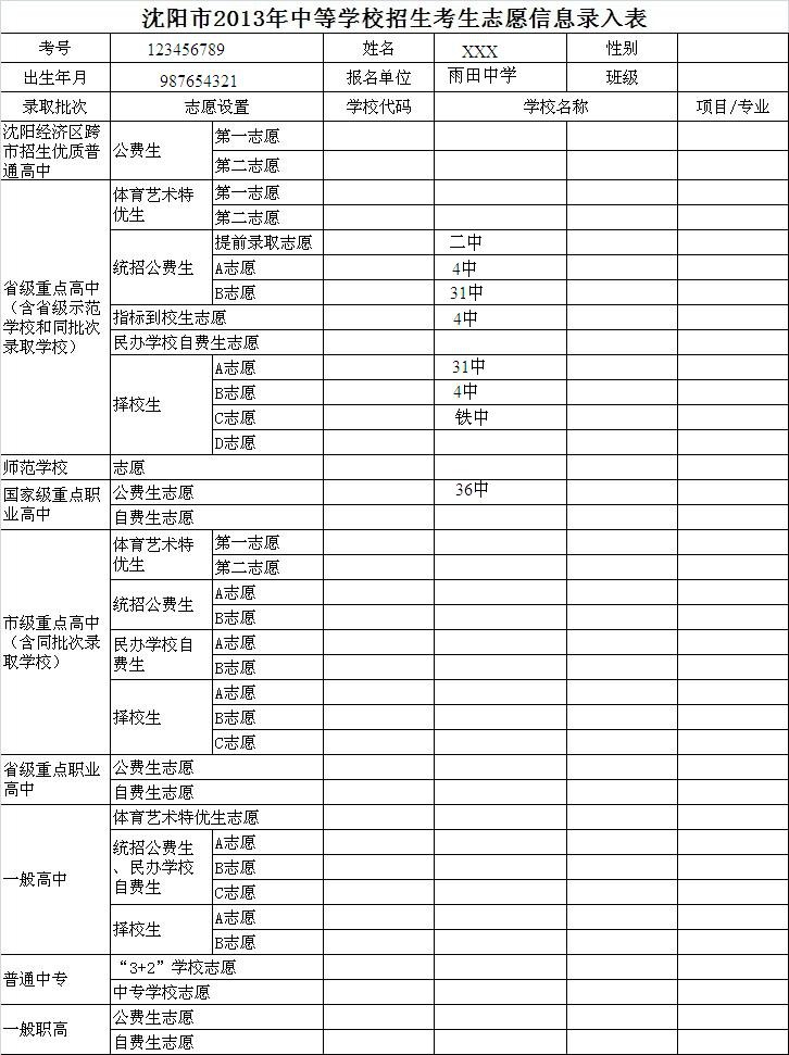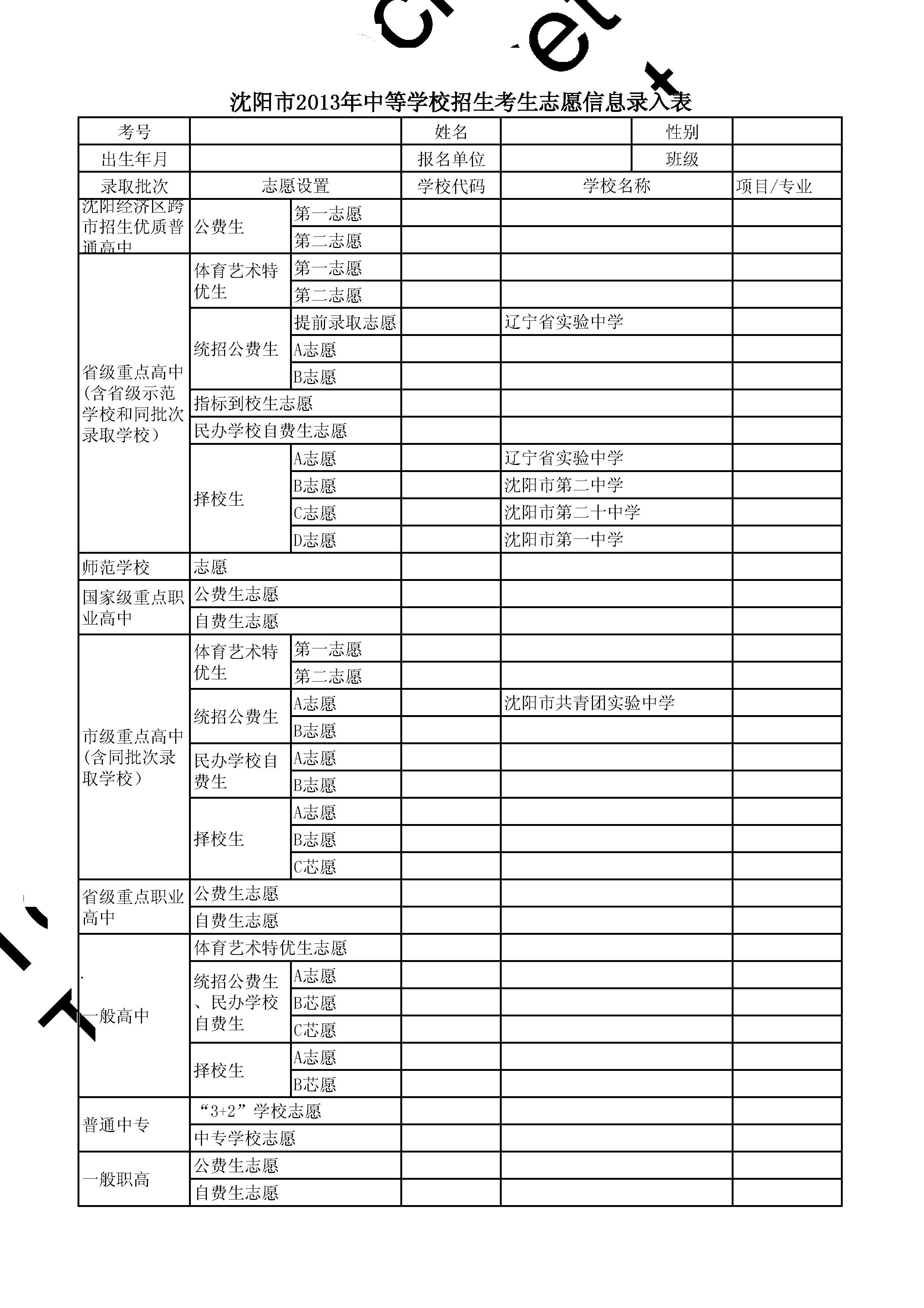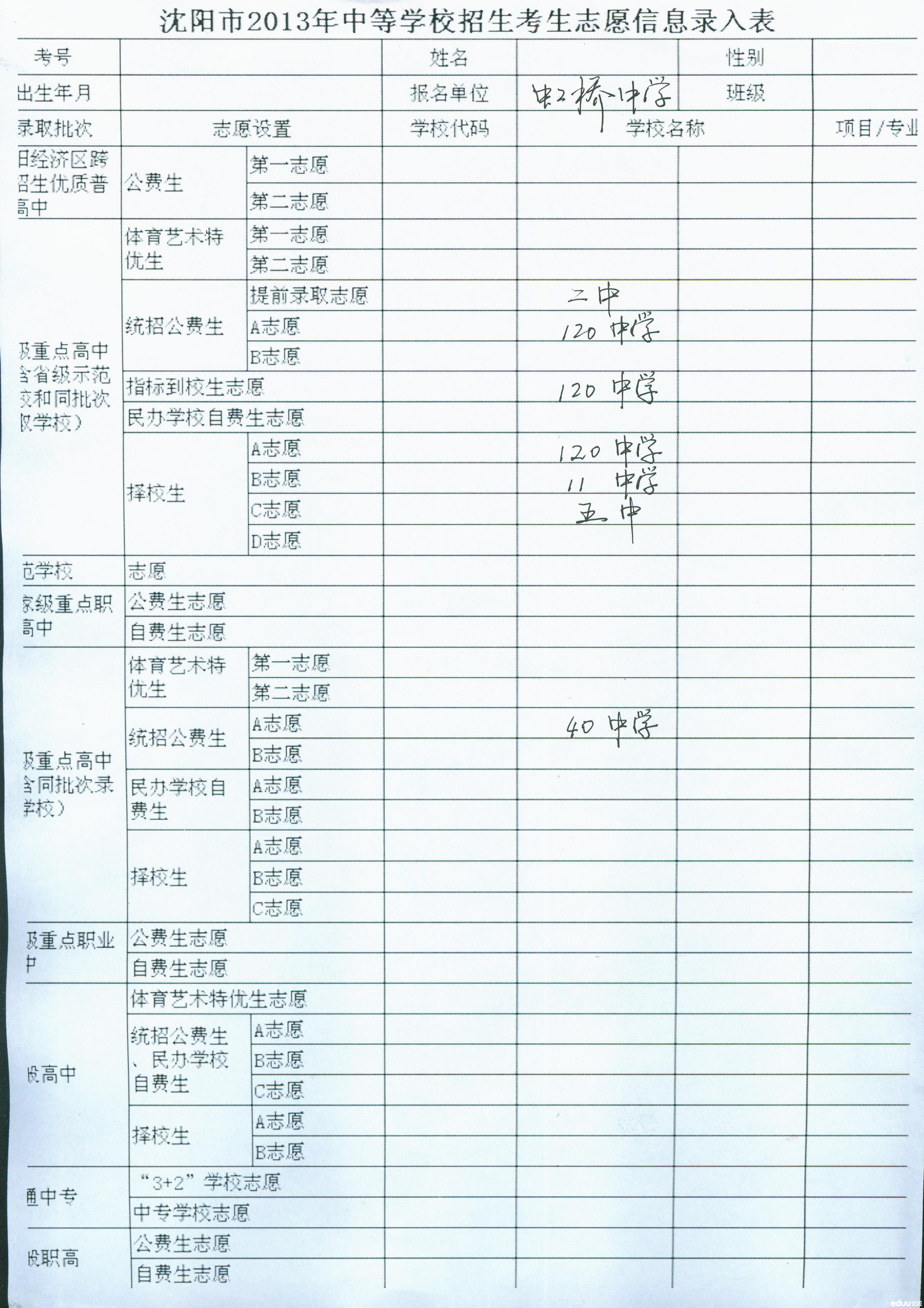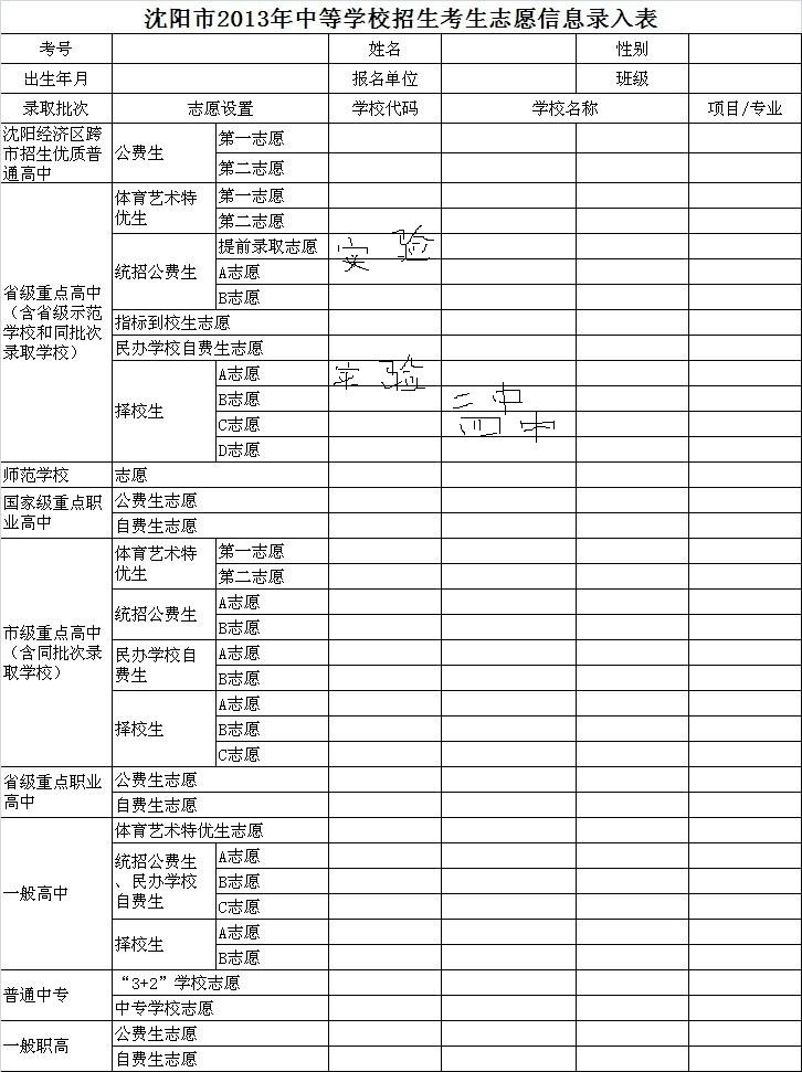 沈阳中考网:为了提早让大家对中考志愿填报有所了解,沈阳中考网现将2013年中考志愿填报表样表展示如下: