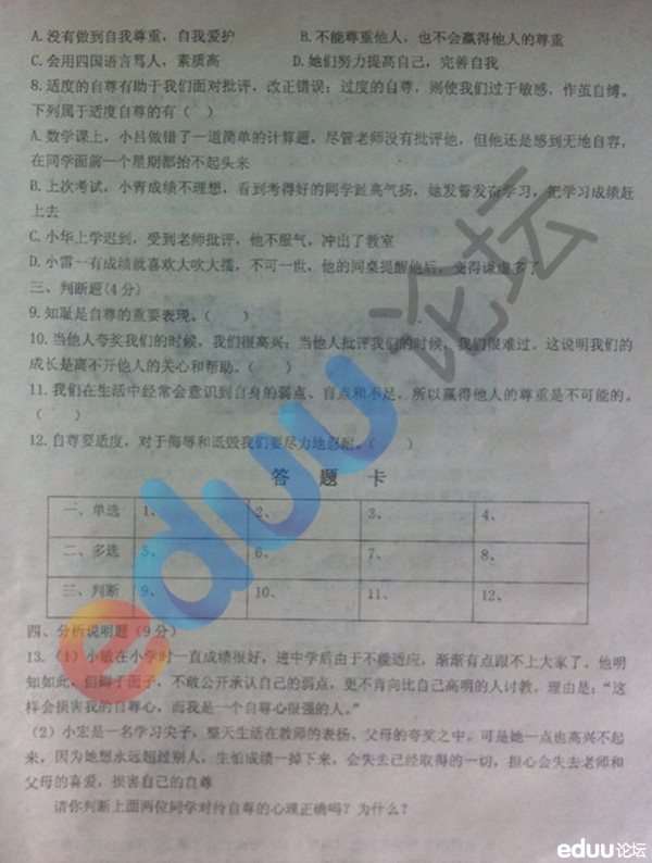 2013-2014学年沈阳市初一下月考思想品德试题(2) 2014-04-08 13:30:42文卿 [查看原帖参与讨论] 编辑推荐: 2013-2014学年沈阳市初一下月考数学试题 2013-2014学年沈阳市初一下月考语文试题 2013-2014学年沈阳市初一下月考历史试题 2013-2014学年沈阳市初一下月考地理试题 2013-2014学年沈阳市初一下月考生物试题