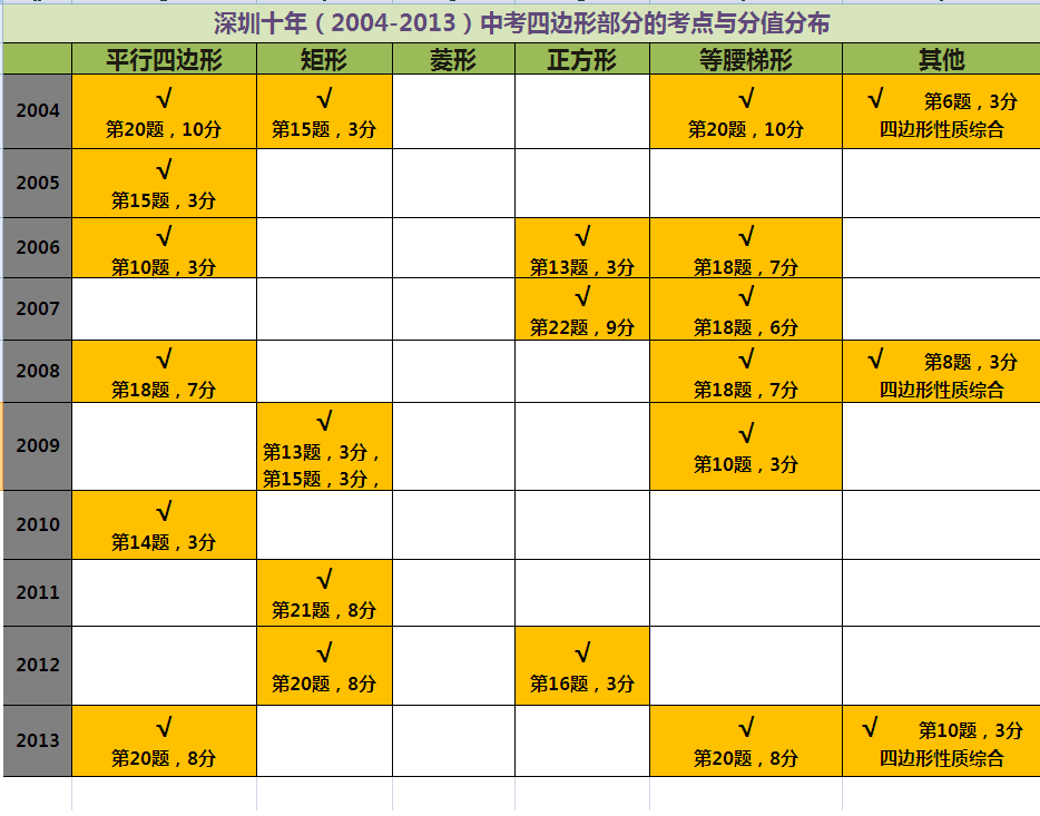 我们先来看一下下边关于最近十年(2004-2013)深圳中考涉及四边形题目的图表总结: