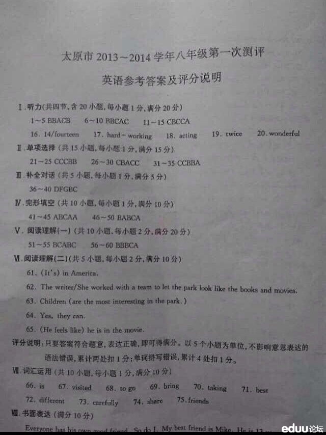太原市2013-2014学年八年级上册英语期中试题答案 2013-11-29 18:19:48佚名 太原中考网:太原市2013-2014学年八年级上册英语期中试题答案 推荐阅读: 太原市2013-2014学年八年级上册英语期中试题