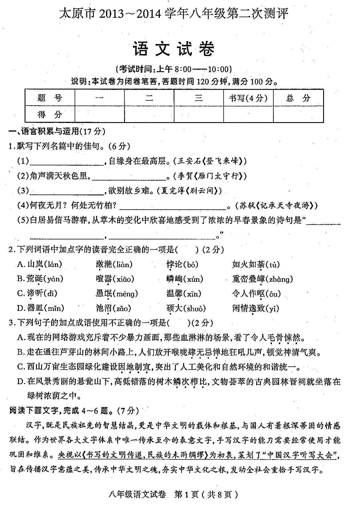 太原市2013-2014第二次测评八年级语文试卷及答案 2014-01-17 15:04:50iamet78 太原市2013-2014第二次测评八年级语文试卷及答案 2013-2014上八语文期末.doc [查看原帖参与讨论]