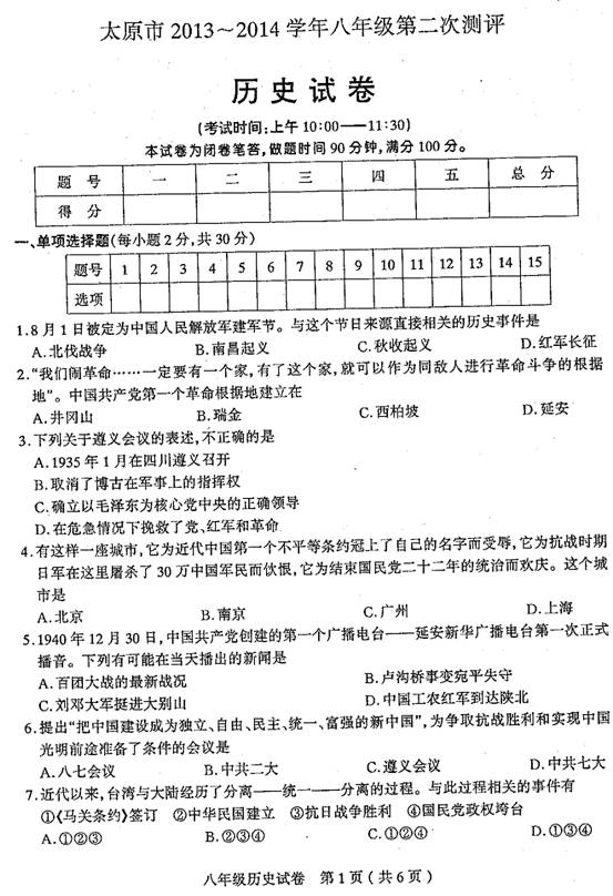 太原市2013-2014第二次测评八年级历史试卷及答案
