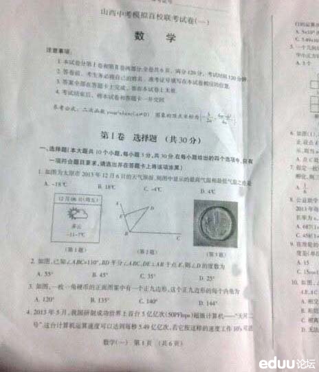 2014年“山西中考模拟百校联考一”数学试题