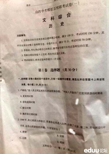 2014山西中考模拟百校联考一文综试题及答案(2)