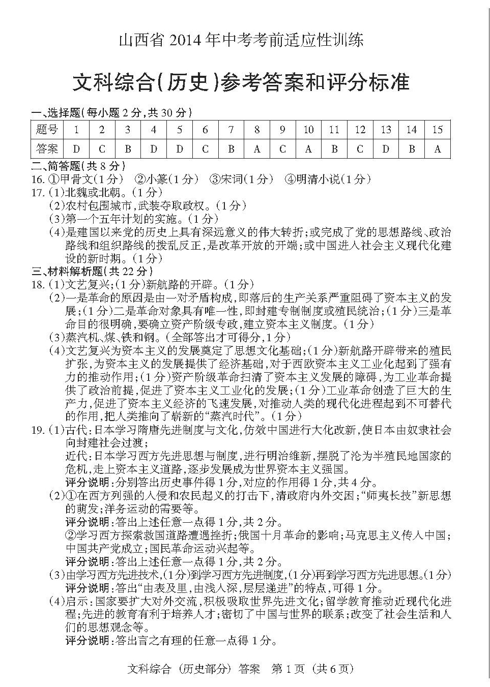 山西省2014年中考考前适应性训练文综(历史)试题答案