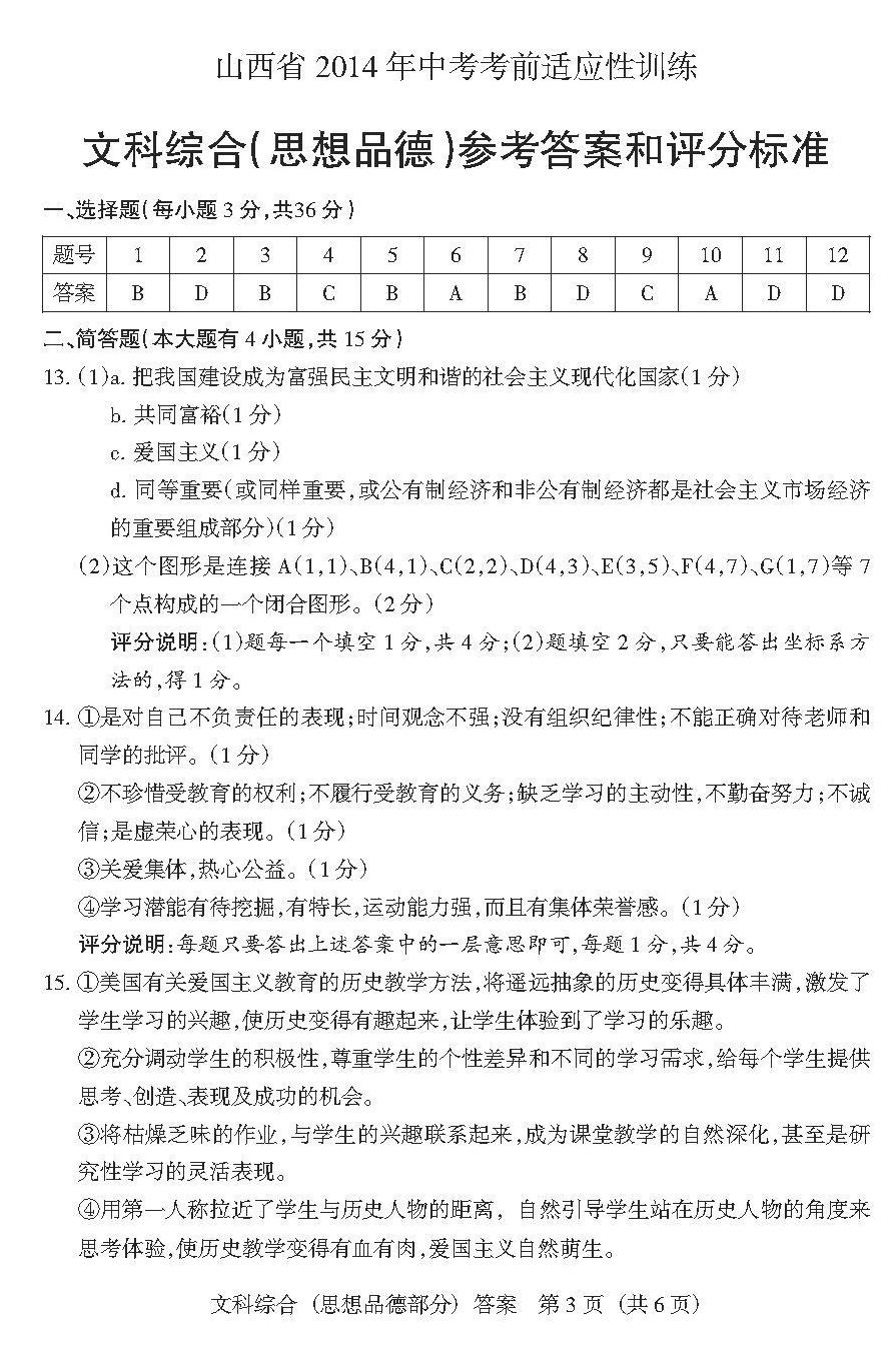 山西省2014年中考考前适应性训练文综(思想品德)试题答案