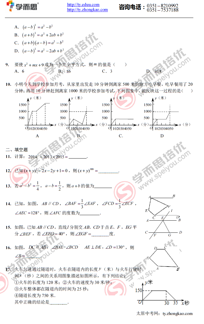 太原2013-2014初一下学期数学期中考试模拟题解析