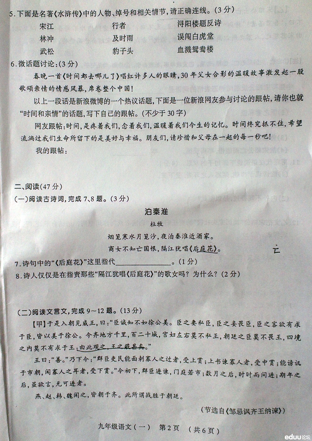 太原市2014年初中毕业班综合测试(一)语文(2) 2014-04-23 16:39:31手掌心 编辑推荐: 太原市2014初中毕业班综合测试(一)英语 太原市2014年初中毕业班综合测试一数学试题 太原市2014年初中毕业班综合测试(一)数学答案 太原市2014年初中毕业班综合测试(一)物理