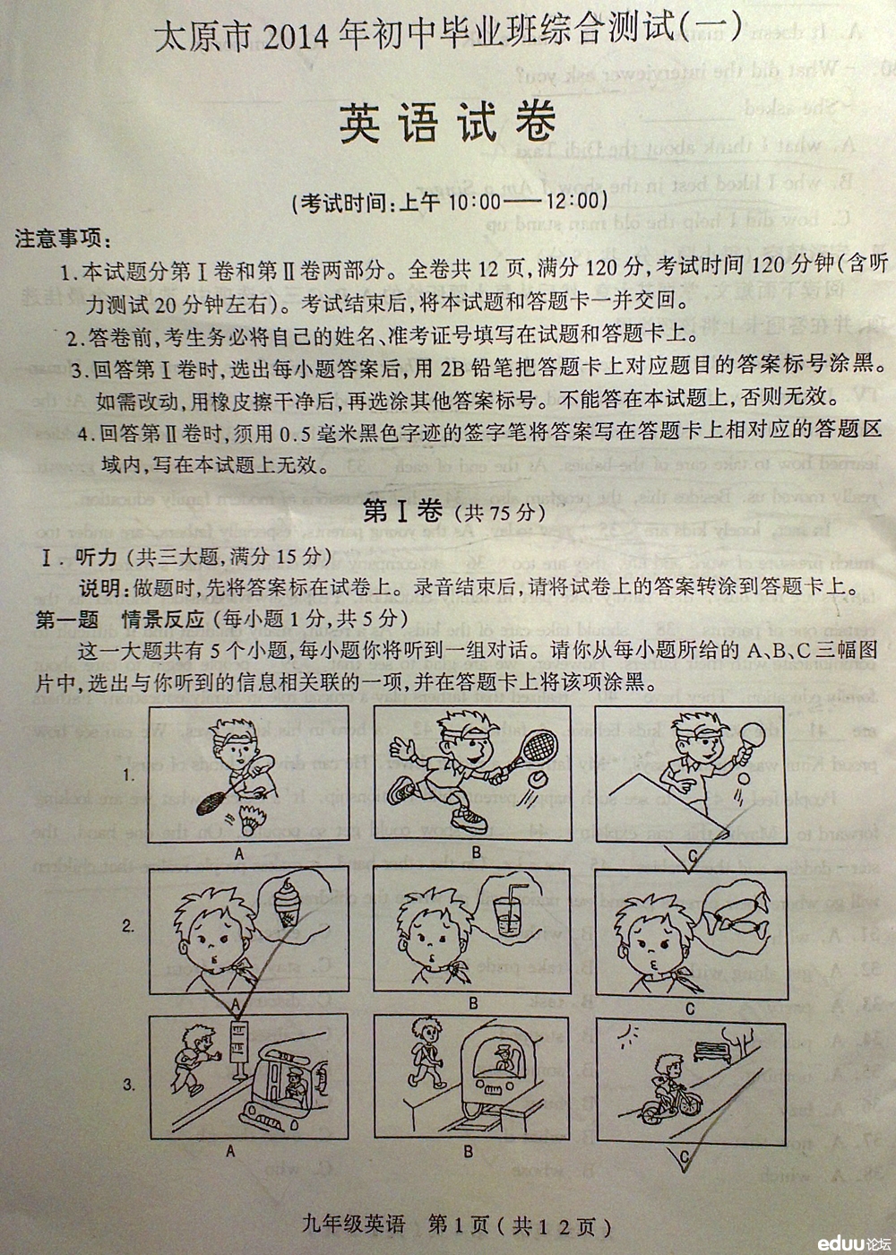 太原市2014初中毕业班综合测试(一)英语(13) 2014-04-23 16:54:13遇见2014 编辑推荐: 太原市2014年初中毕业班综合测试一数学试题 太原市2014年初中毕业班综合测试(一)数学答案 太原市2014年初中毕业班综合测试(一)语文 太原市2014年初中毕业班综合测试(一)物理