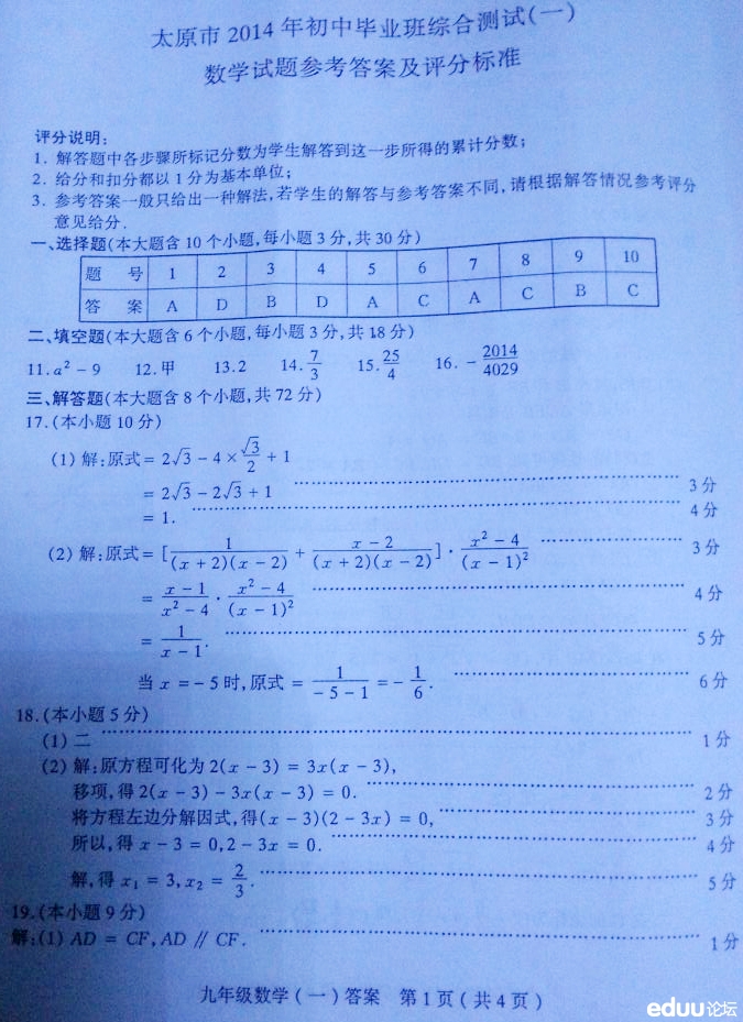 太原市2014年初中毕业班综合测试(一)数学答案 2014-04-23 17:02:25手掌心 太原市2014年初中毕业班综合测试(一)数学答案 编辑推荐: 太原市2014年初中毕业班综合测试一数学试题 太原市2014初中毕业班综合测试(一)英语 太原市2014年初中毕业班综合测试(一)语文 太原市2014年初中毕业班综合测试(一)物理