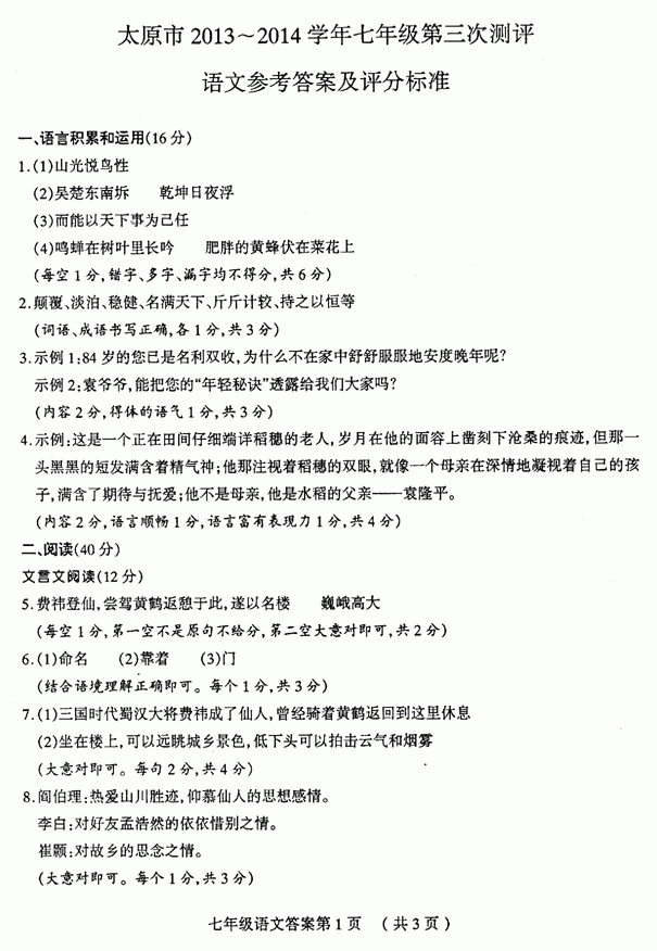 太原市2013-2014七年级第三次测评语文试题答案