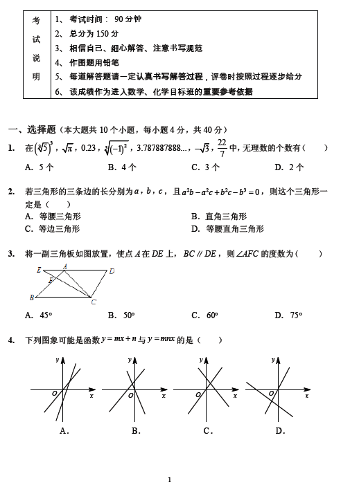 太原学而思新初三目标板选拔考试数学试卷