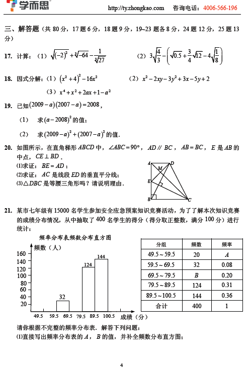 太原学而思新初三目标板选拔考试数学试卷(4)