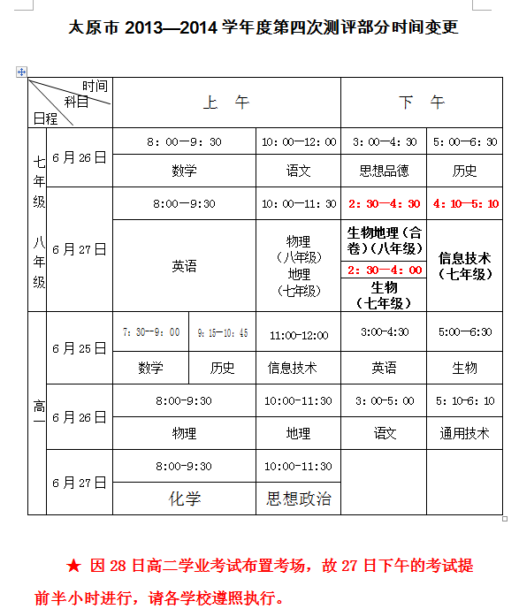太原中考网讯 太原市2013—2014学年度第四次测评部分时间变更已出,具体如下。