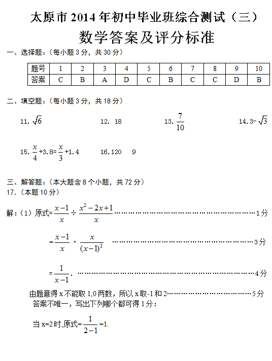 太原市2014年初中毕业班综合测试三数学答案