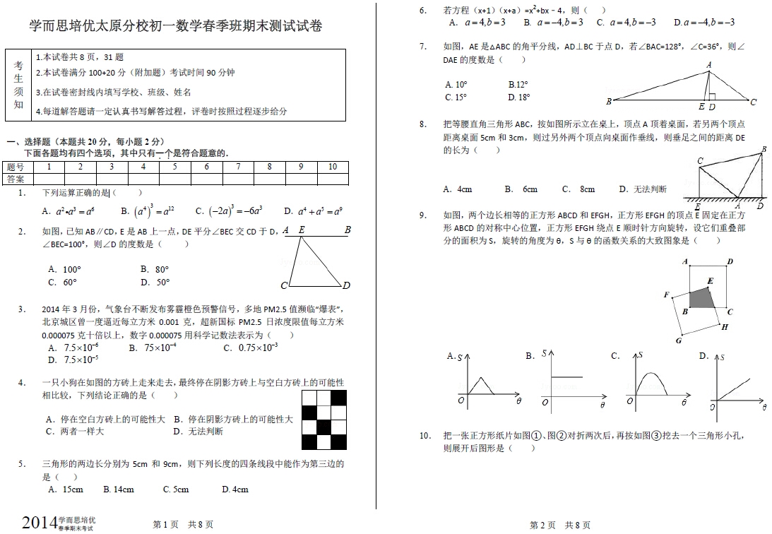 太原中考网讯 2014太原学而思初一数学春季班试卷已出,具体如下。