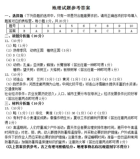 太原中考网讯 太原市2014年八年级结业考试地理答案已出,具体如下。