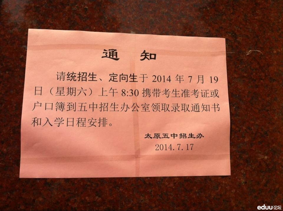 2014年太原五中中考录取通知书领取时间 2014-07-17 13:08:05Yang1998vip 2014年太原五中中考录取通知书领取时间:7月19日 【查看原帖并参与讨论:2014年太原五中中考录取通知书领取时间】