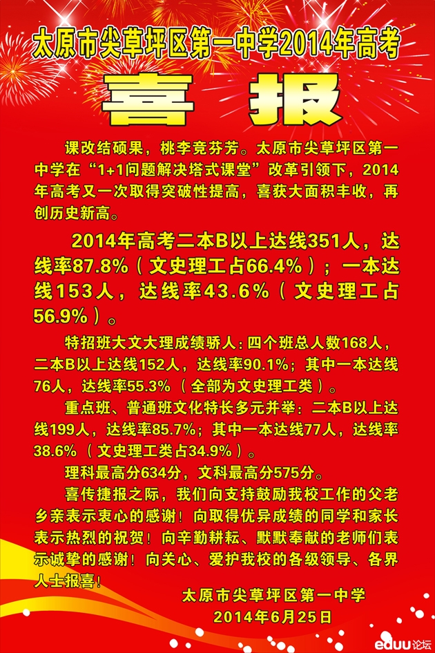 【查看原帖并参与讨论:2014年太原尖草坪一中高考喜报】