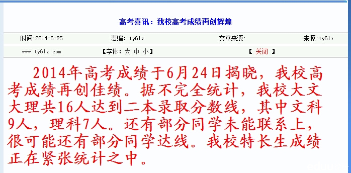 2014年太原六十一中高考成绩:我校大文大理共16人达二本录取分数线,其中文科9人,理科7人