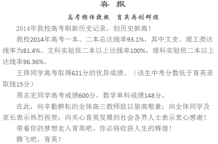 2014年太原育英中学高考喜报如下: