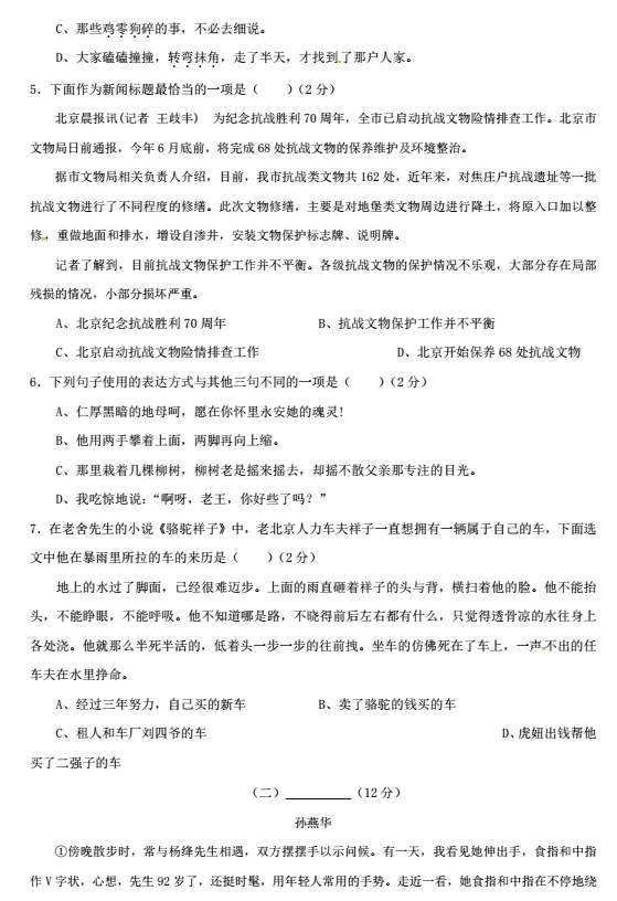 山西农大附中2017-2018学年初二上期中考试语文试题(2)
