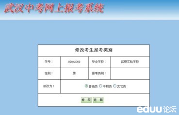 注:点击“修改报考类别”后,系统会进入修改报考类别页面。考生可看到如下提示:如果从普高类,修改为中职类或其它类,则原来的志愿信息将会清空。