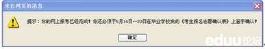 此时,报名志愿信息尚未生效,考生可在当前状态下与《考生报名志愿草表》核对报名志愿信息,并可点击页面下方的[返回修改]按钮,对自己的报名志愿信息进行修改。当确认无误后,点击[填写完毕,确认保存],考生报名志愿信息生效。考生可看到如下提示: