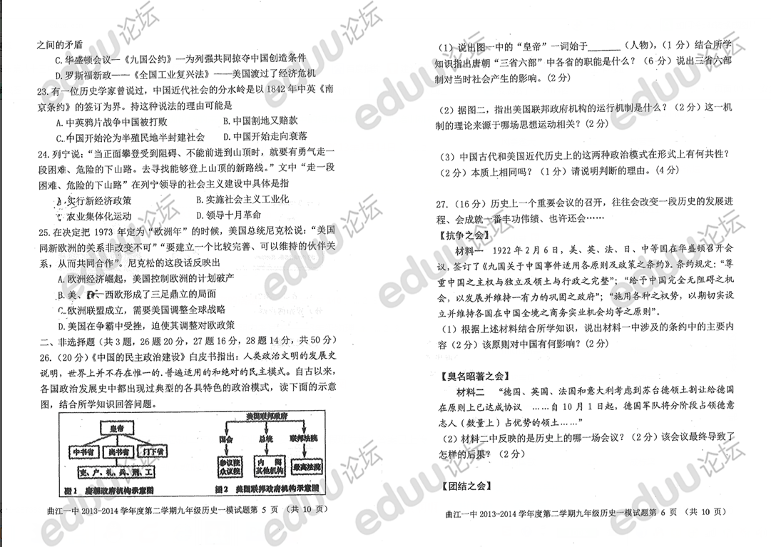 陕师大附中(曲江一中)2014第一次中考模拟史政试题(3)