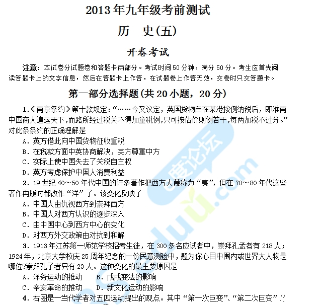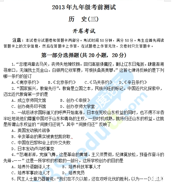 2013年郑州市九年级考前测试历史试卷(1-5)