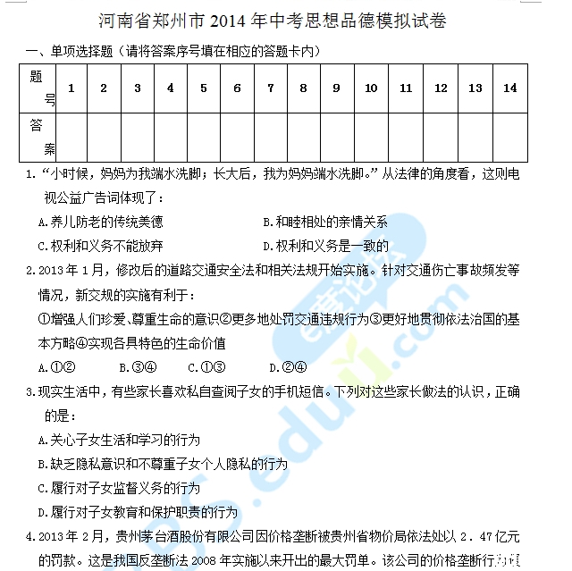 郑州市2014年中考模拟试卷两套(政治) 2014-04-26 11:27:381234go 郑州中考网讯:郑州市2014年中考模拟试卷两套(政治)如下: 政治科目:中考思想品德模拟试卷.doc 历史科目:点击下载中考历史模拟试卷.doc [查看原帖参与讨论]