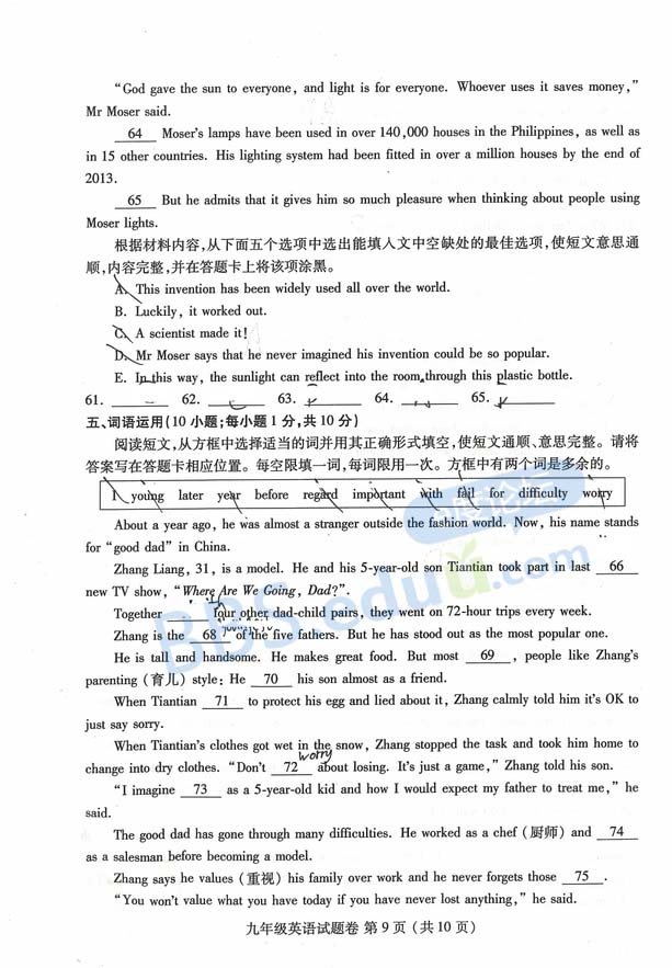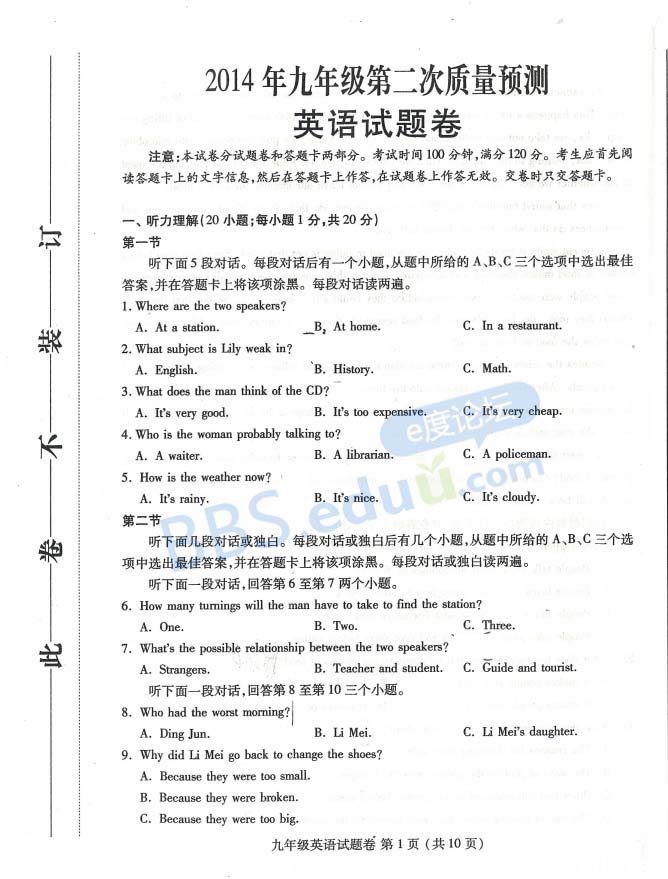 2014郑州九年级第二次质量预测英语试卷(在线预览+下载)
