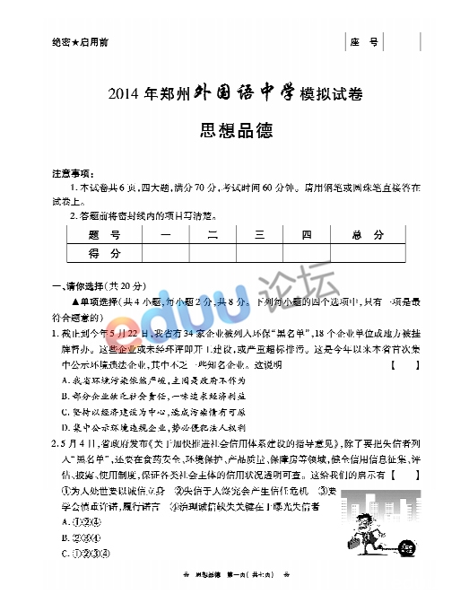 2014年郑州外国语中学第二次中考内测政治试卷