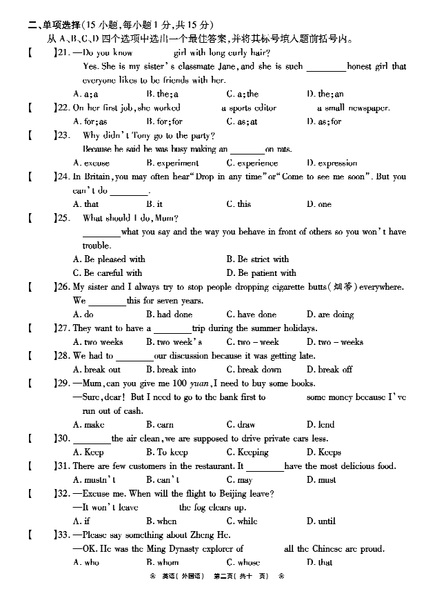 2014年郑州外国语中学第二次中考内测英语试卷(3)