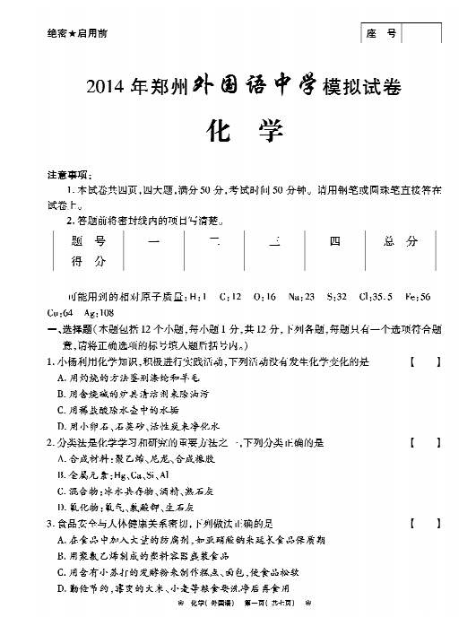 2014年郑州外国语中学第二次中考内测化学试卷 2014-06-17 18:12:15木槿花西月 郑州中考网讯 比较好的试卷(启用前☆绝密)分享给大家,答案稍后速度更新出来(整理成PDF版,含答案),大家关注一下!