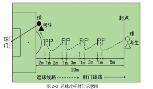 运射:从罚球区线中点垂直向场内延伸至20米处,画一条平行于球门线的横线作为起点线。距罚球区线2米处起,沿20米垂线共插置8根标志杆。考生将球置于起点线上,运球依次绕过8根标志杆后起脚射门,球动开表,当球从空中或地面越过球门线时停表,记录完成的时间。凡出现漏杆、射门偏出球门,球击中横梁或立柱弹出,均属犯规,不计成绩。每人测试2次,取最好成绩。